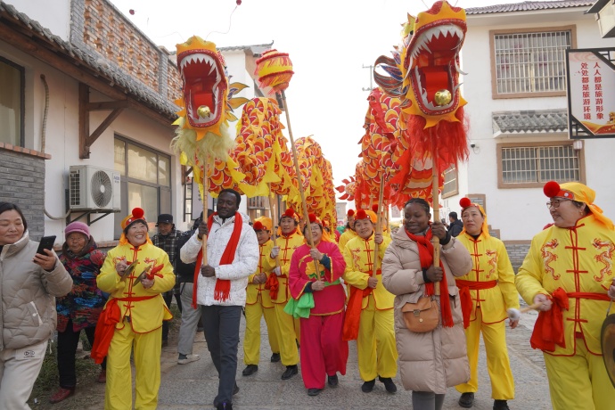 どらを打ち、太鼓を打ち、龍舞するのは地元の正月の風習で、新しい年の天候が順調で、五穀豊穣を祈る。このすばらしい公演は、現場の観衆から喝採を受け、外国人の友人から好評を博した。ジャマイカから来たBaileyさんは「本当の中国文化を体験し、農民がダンスで自分を表現しているのを見て、竜頭を掲げて村の人と一緒に踊ったのは素晴らしい経験でした。」といった。