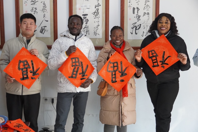 外国人の友人は地元の農民と一緒に春聯を書いたり、餃子を作ったりして、楽しい雰囲気の中で本場の中国の春節を体験した。ガーナから来たDavidさんは「とても楽しかったです。みんなで餃子を作ったり、福の字を書いたり、龍舞をしったりして、中国の春節が好きになったです」と言った。