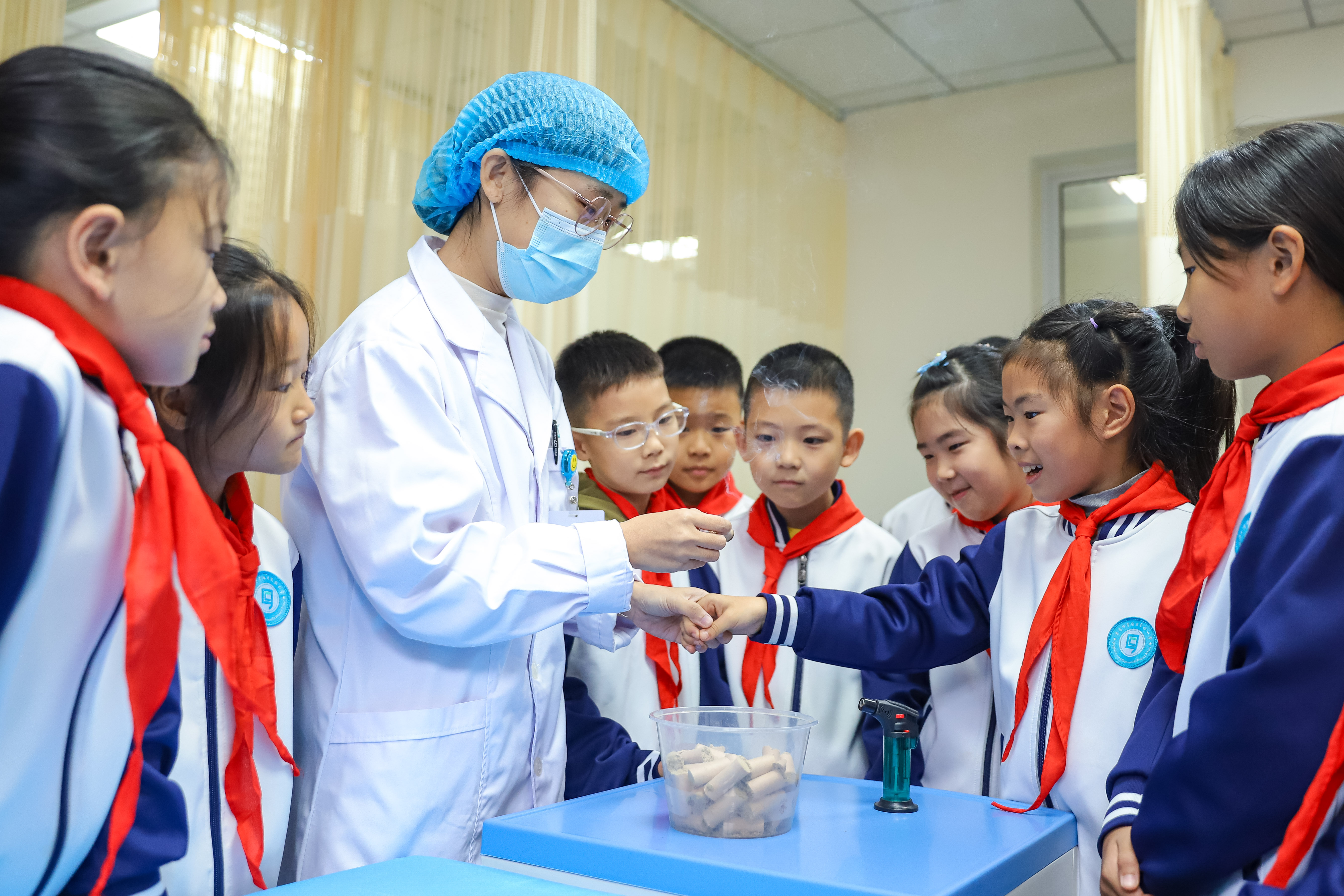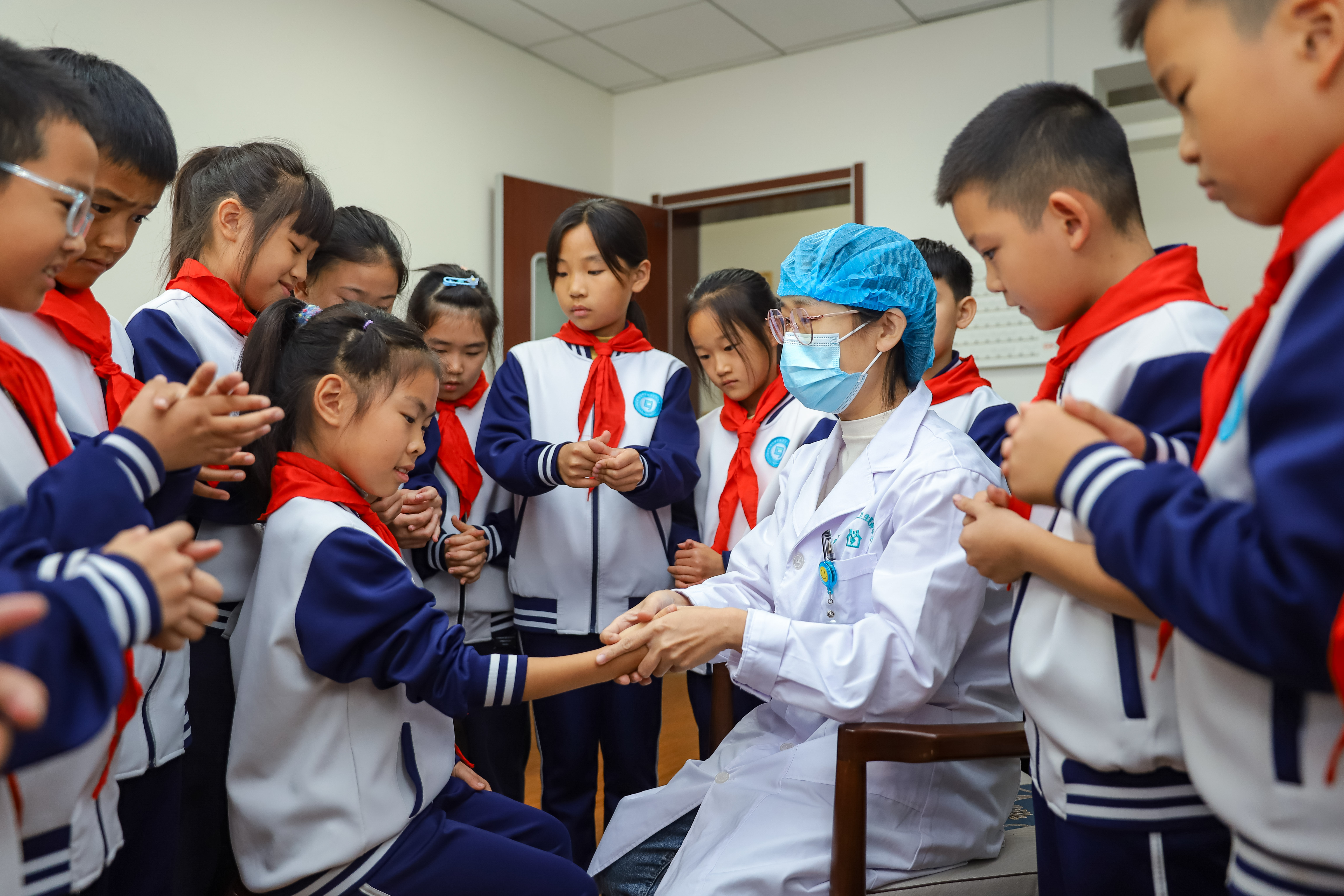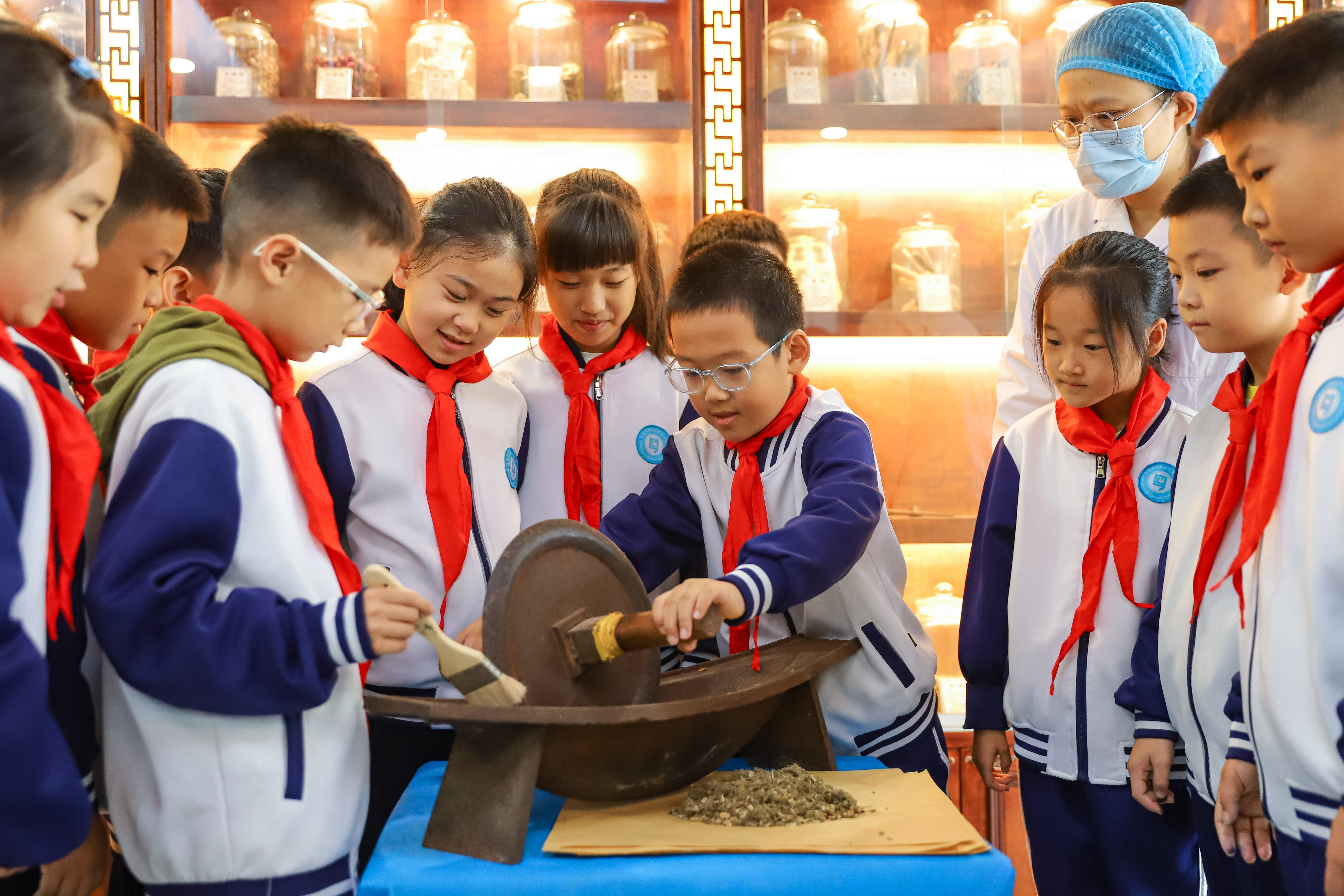 10月21日、世界伝統医薬デーにあたり、山東省青島市李滄区実験小学の生徒たちが李村街道のコミュニティ保健サービスセンターで開催された「中医・中薬知識を学び 中国の伝統文化を感じる」課外実践活動に参加した。生徒たちは中医師の指導の下で、中薬を認識し、薬剤の製造過程を了解し、もぐさ灸を体験し、さらに中医・中薬について間近で理解し、中医の伝統文化の魅力を感じた。(撮影:張鷹)