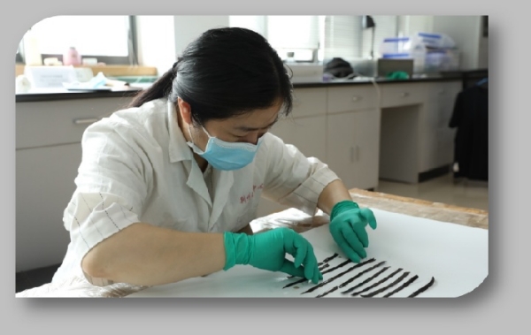 징저우 문물보호센터 직원이 출토된 초간을 순서대로 정돈한다.