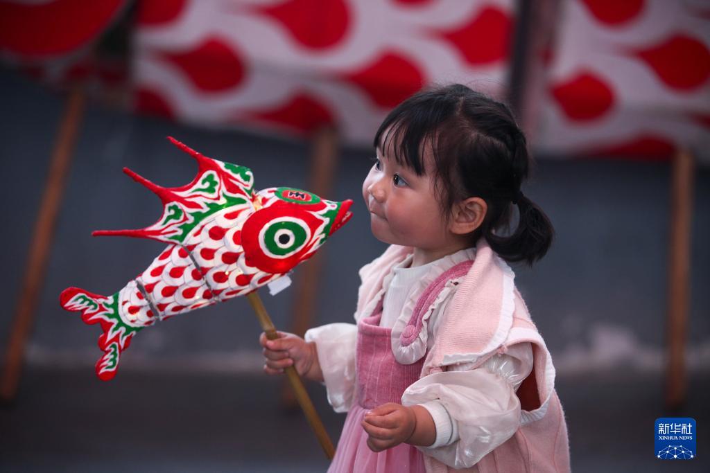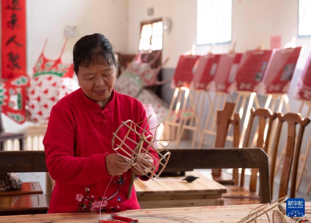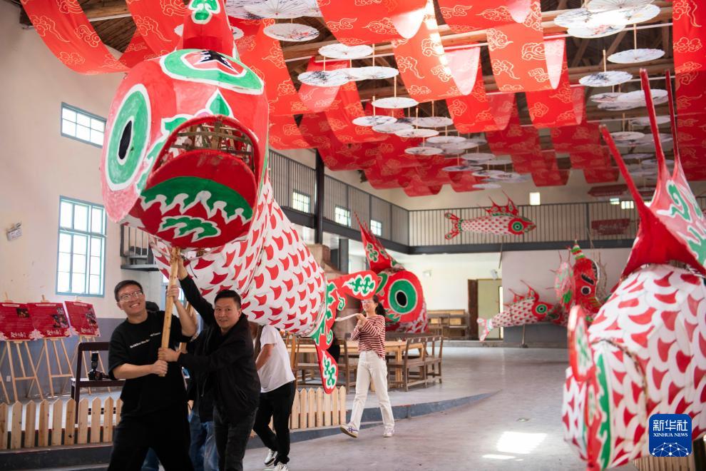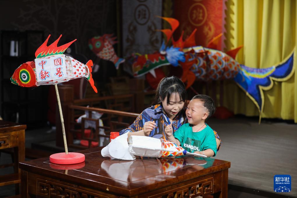 5월 17일, 서현 후이저우고성 어등(魚燈, 물고기 모양의 등) 박물관에서 한 모자가 어등을 만들고 있다.