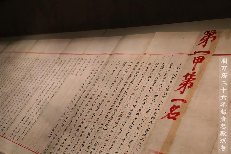 칭저우시박물관 전시실에 들어서면 거대한 투명 전시대 안에 이 노란 장원권이 정성스럽게 보관되어 있다. 이 장원권은 길이 268cm, 높이 47.6cm로 3겹의 선지(宣紙, 서화용의 고급 종이)를 사용하여 장식되어 있고 총 19장의 접지로 구성되어 있으며 앞뒤 두 부분으로 나뉘어져 있다. 앞부분은 총 4장의 접지로 저자와 그의 조상 3대의 이력서가 있는데 방송체(仿宋體)로 작성되었다. 첫 접지에는 전서(篆書, 한자 발전 과정의 고대 서체)로 쓰인 ‘예부지인(禮部之印)’ 4글자의 각인 인장이 있으며, 이 부분은 밀봉되어 있다. 봉인에는 ‘미봉관방(彌封關防)’이라는 긴 인장이 찍혀 있는데 이는 수험생의 이름과 이력서 부분이 밀봉되어 유출되지 않도록 하기 위함이었다. 뒷 부분은 본문으로 전체 2460자이며 15장의 접지로 구성되어 있고 1cm 정사각형의 관각체(館閣體)로 작성되었다. 놀랍게도 이 장원권의 글씨는 깔끔하고 일관되며 수정된 흔적이 전혀 없어 인쇄체와 견줄 만하다. 권수(卷首)에는 만력 황제의 친필로 쓰인 ‘제일갑 제일명(第一甲第一名)’이라는 6글자가 있고 권미(卷尾)에는 대학사 및 예부 상서(禮部尚書), 편부 상서(編部尚書) 등 9명의 채점관과 1명의 인쇄관의 직책과 이름이 새겨져 있다.