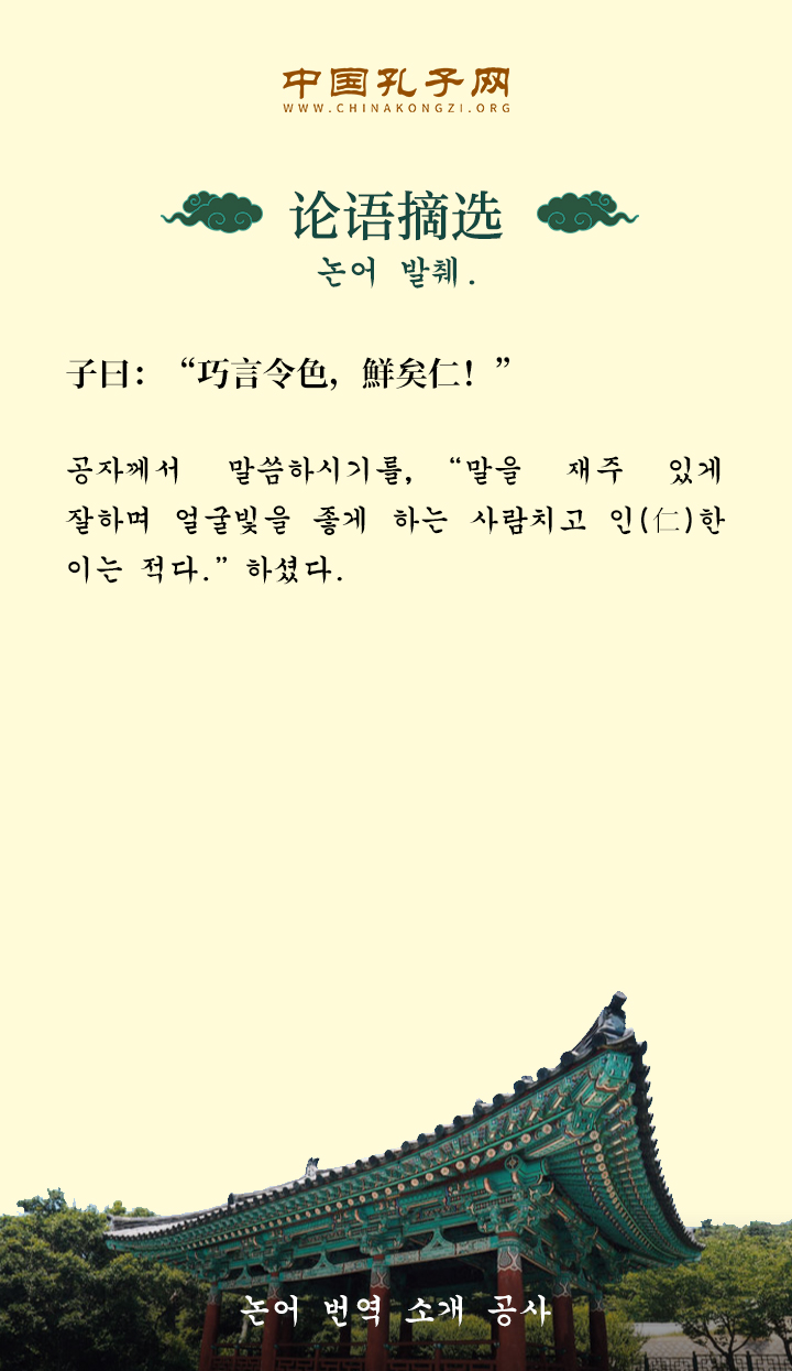 공자께서 말씀하시기를,“말을 재주 있게 잘하며 얼굴빛을 좋게 하는 사람치고 인(仁)한 이는 적다.”하셨다.