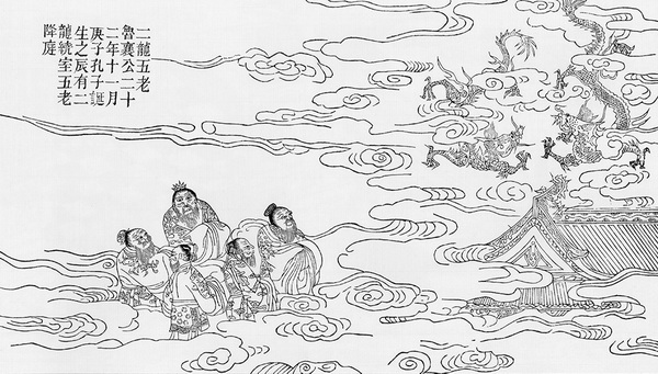 후세 사람들이 공자를 위해 편집한 신기한 이야기.공자가 태어난 밤에 창룡이 두 마리 하늘에서 내려와 공자의 집을 감싸고 돌면서, 다섯 명 신선(神仙)이 천악(天乐) 나타에 공자집에 내려왔습니다.이 이야기는 상서적인 소재인 이룡오노(二龍五老)가 됐다.