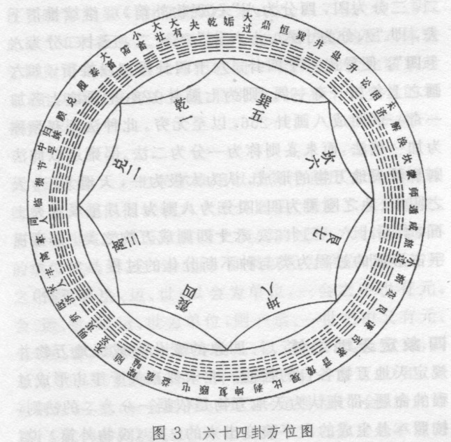 阴阳消长说 邵雍以探讨天地万物的运动变化和阴阳消长为其哲学的宗旨。其八卦和六十四卦方位图的哲学意义,就是用来说明事物变化的规律,认为宇宙中的事物总是处于阴阳推移的过程,没有永恒不变的东西。在他的伏羲八卦方位图(图2)中,乾为天,左半圈由下而上,表示阳气生长,辟户而始生万物;坤为地,右半圈由上而下表示阴气增长,阖户而收藏万物。离为日,起于东方;坎为月,生于西方。天地阖辟,形成春夏秋冬,日月出入,形成昼夜长短、晦朔弦望。一年四季天地万物的生成变化乃阴阳消长的过程。六十四卦方位图(图3)则以左半圈从复卦到乾卦,右半圈从姤卦到坤卦,即十二消息卦表示此种阴阳消长的过程。复卦w0601001表示一阳生,至临卦w0601002表示二阳生,至泰w0601003为三阳生,大壮为四阳生,央为五阳生,乾卦为六阳生,乾为阳极盛,表示一年四季或人类历史中的极盛时期。姤卦w060104表示一阴生,至遁卦w0601005表示二阴生,至否为三阴生,观为四阴生,剥为五阴生,至坤w0601006为六阴生,坤为阴极盛,表示一年节气变化的终结或现在这个世界的毁灭。以后复卦一阳复生,新的一年或又一个世界接续而生,如此循环无穷。阴阳消长是宇宙和人类社会发展的普遍规律。
