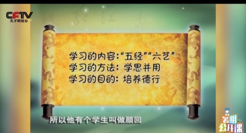 学习的内容:“五经”“六艺”。五经就是《诗经》、《书经》、《礼经》、《乐经》跟《易经》这五本经典,《六艺》是六种生活技能,包括礼跟乐、射箭、驾马车,还有书写跟计算。学会这些才能安身立命。