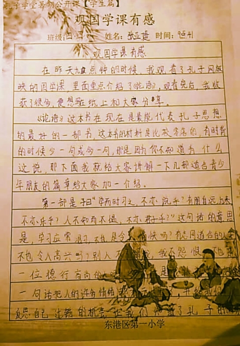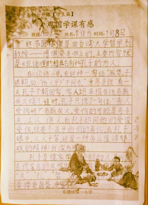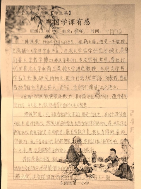 按:2018年7月7日,“孔子学堂暑期名师公开课”第一期课程如期开课啦,本期课程由国学大师傅佩荣先生开讲《论语》里的人生智慧,帮助孩子培养积极向上的态度。这堂五星好评、口碑爆棚的公开课,第一期便有超4万人在线观看!日照市东港区第一小学作为孔子学堂重要单位,不仅组织了同学们观看学习,更带领大家“温故而知新”,再次重温了这精彩的一课。