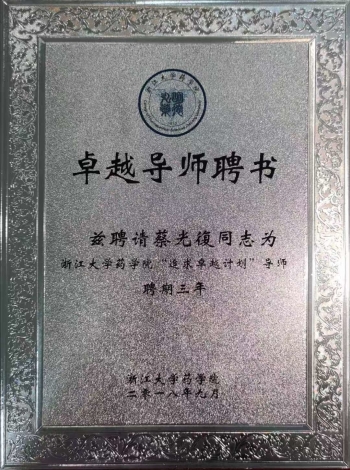 浙大药学院党委书记胡富强为蔡老师颁发了“追求卓越计划”导师荣誉聘书、捐赠荣誉证书和鸣谢牌。