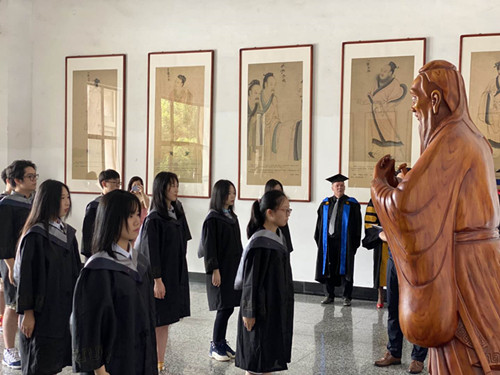 上午8:30份,华维国际部高三学子列队来到位于信息楼的“华维孔子学堂”,在叶锦江校长带领下,在孔子像前进行“拜孔谢师”仪式,一起祭拜至圣先师,感谢师恩。