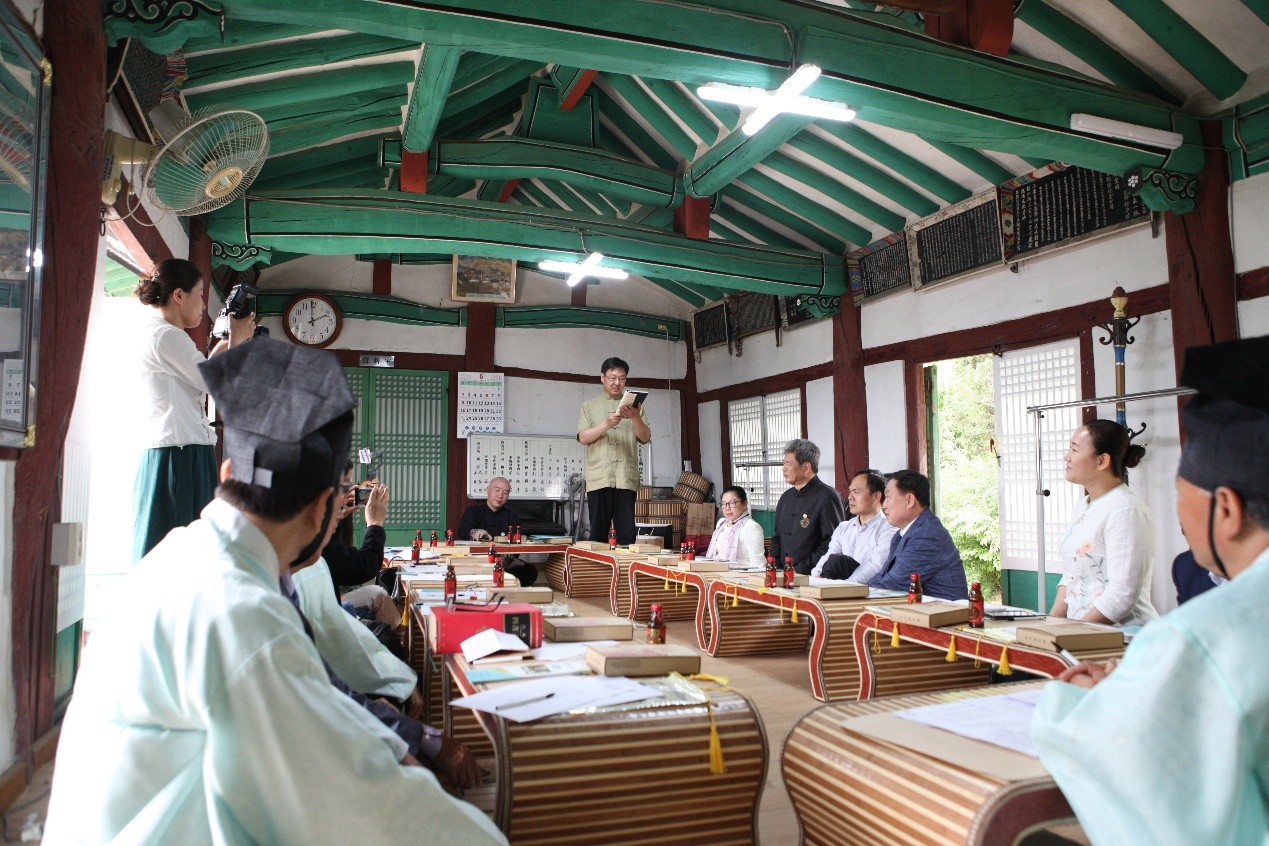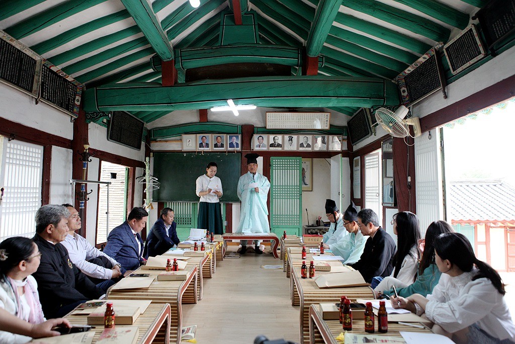 下午,中韩双方的吟诵交流活动在温阳乡校的明伦堂举行。湖南省吟诵学会副会长兼秘书长、湖湘吟诵传承人曹琴为大家吟诵了《论语》选章,四川省吟诵学会会长、绵阳市非遗传承人王传闻为大家用北京国子监、江南、四川和浙江的四种吟诵调为大家吟诵了《论语》选章和朱熹的《九曲棹歌》,济南汶源书院秘书长、执行副院长刘强为大家诵读了《诗经·关雎》。
