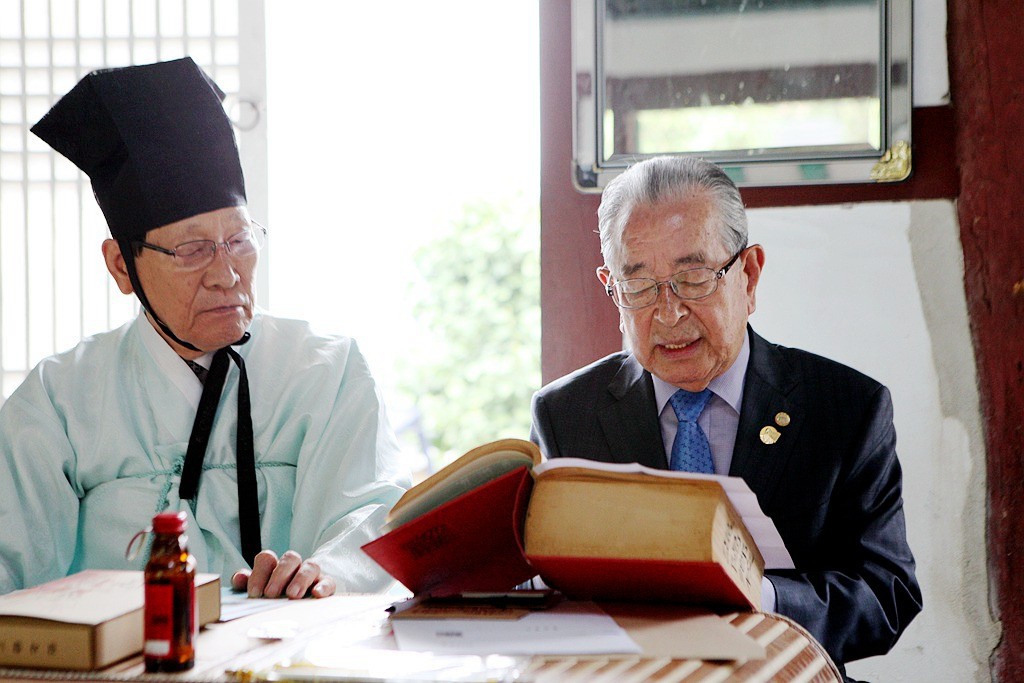 朴钟德院长对中国孔子基金会一行人的到来表示热烈的欢迎,他向大家介绍了温阳乡校的基本情况:乡校是韩国历代教授儒学、祭祀孔子与诸圣贤的地方教育机构,在中央设成均馆,是国家的最高学府,地方各道和邑设有乡校,至今已有878年的历史。如今,乡校在韩国仍发挥着不可替代的作用,有儒学教育和祭祀圣贤两方面的功能。教育方面,韩国儒林会在初一、十五以及每周末在乡校内共同学习研讨,另外,乡校的老师们每周两至三天都会去机关、学校等教授圣贤书籍、书法等;祭祀方面,在初一、十五、孔子诞辰和逝世日都会举办相应的祭祀仪式。温阳乡校一直保持着传统的品德教育的理念不变,近20年来,温阳乡校在每年的寒暑假都会为中小学生开课,分为初、中、高等班,教学生们学习圣贤书籍的经典语句和忠、孝、仁、爱等道德规范和各种行为准则。他们还不局限于在乡校和儒林会馆内开展教育,还会派出教师外出教学,91岁的李兴馥先生每周都自己开车30公里为其他地方的学生授课,这令我们十分敬佩。