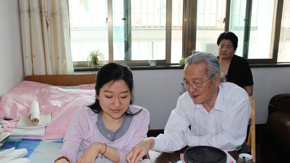 著名书法家张荣庆先生赶往诸城看望刘晓清。图为张荣庆先生给晓清讲解书法要义。