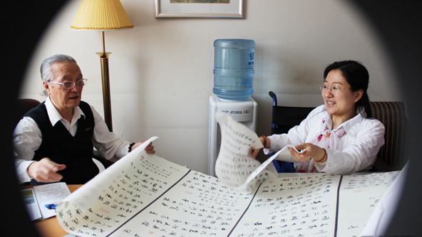 著名书法家张荣庆先生赶往诸城看望刘晓清。图为张荣庆先生欣赏晓清的书法作品。