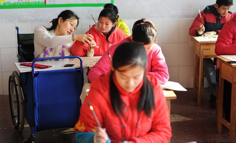 一堂生动的书法课结束了,同学们围绕在“轮椅姐姐”身边,刘晓清鼓励学生们在学好知识的同时,一定要自信、自强、自力。