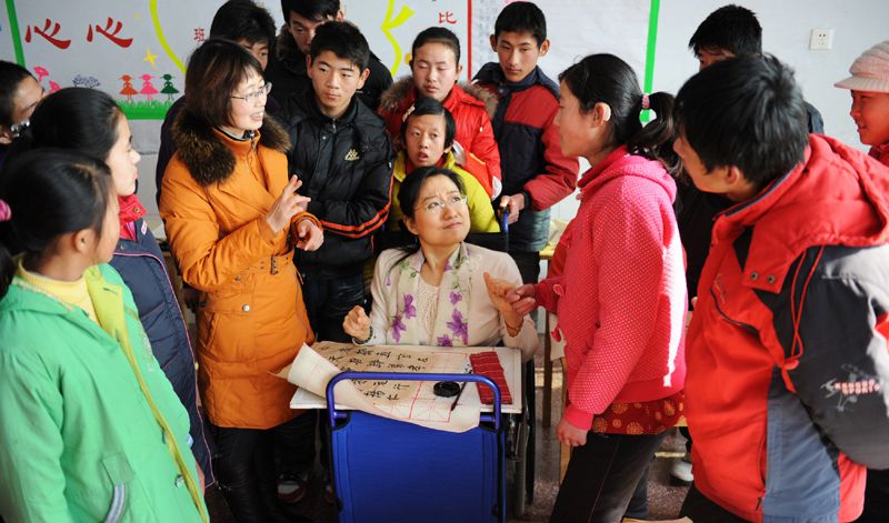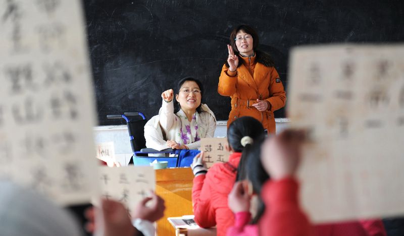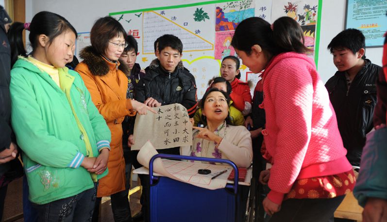 2011年12月29日,诸城特殊教育学校。"中国好人榜"好人刘晓清在手语老师的帮助下,为聋哑学生上了一堂生动的书法课。这也是刘晓清在2011年讲授的最后一堂书法课。