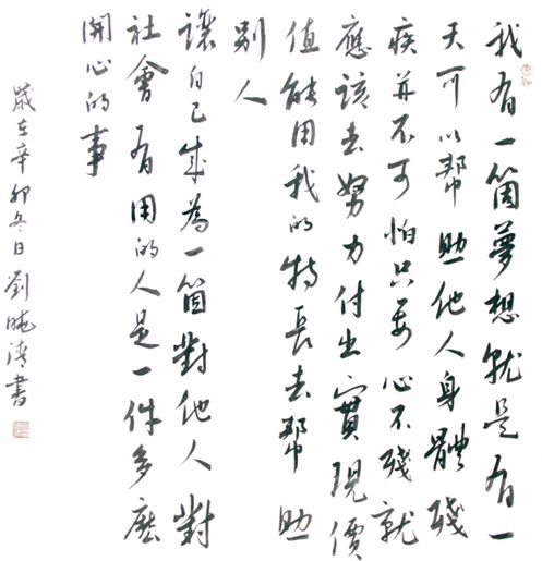 图为“中国好人榜”好人、“最美轮椅姐姐”刘晓清的一封“毛笔信”,信的字里行间洋溢着她笑对人生的态度和乐观向上的精神。刘晓清在信中写道:“我有一个梦想,就是有一天可以帮助他人。身体残疾并不可怕,只要心不残,就应该去努力付出,实现价值。能用我的特长去帮助别人,让自己成为一个对他人、对社会有用的人,是一件多么开心的事!