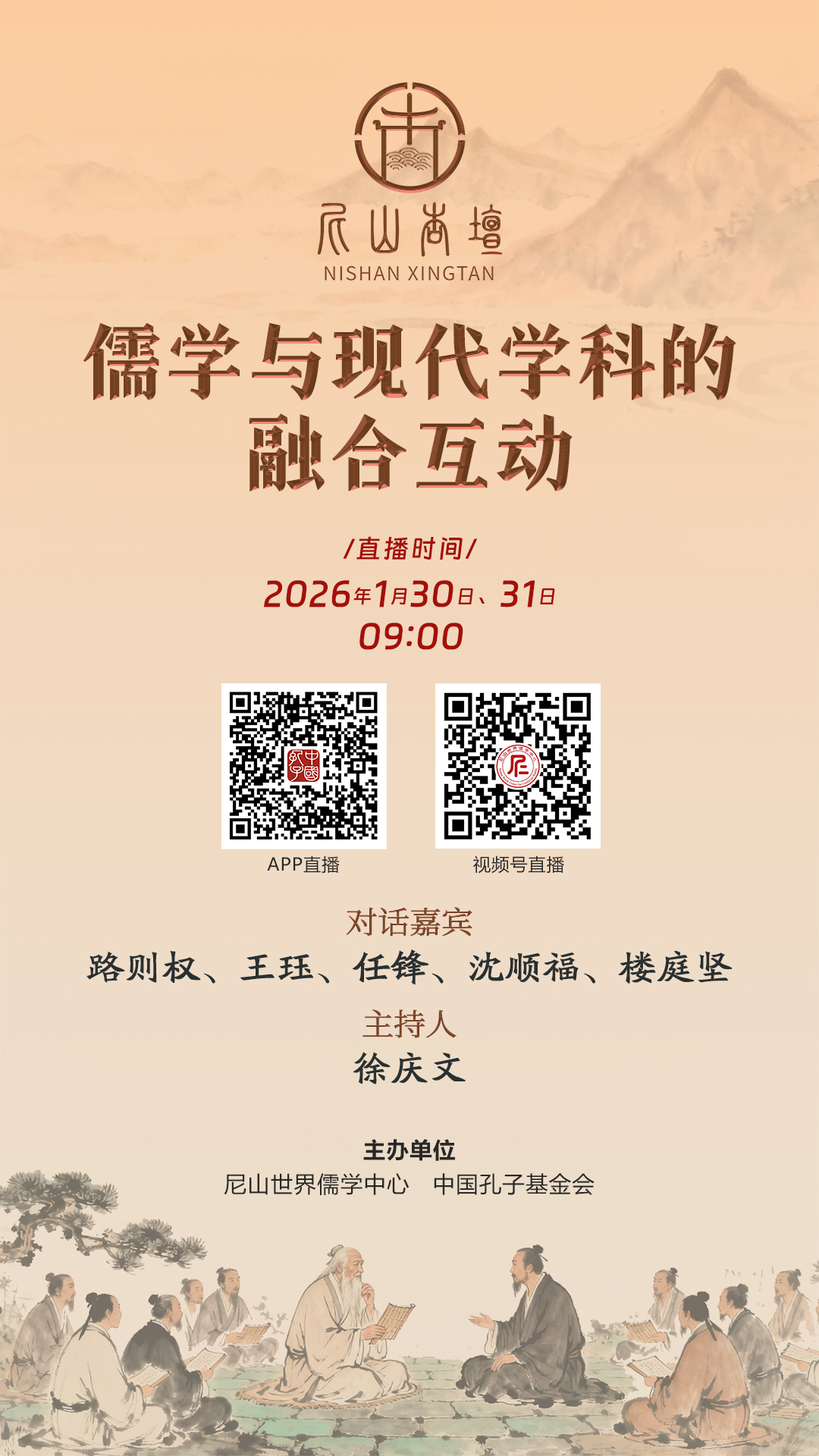 1月30日至31日,“尼山杏坛·儒学与现代学科的融合互动”将正式开播,来自国内知名专家学者带您解锁儒学与经济学、管理学等学科的融合密码——从《孔门理财学》的义利之辨照见现代经济伦理,到“有教无类”理念赋能当代教育创新,再到“天人合一”智慧助力绿色发展实践。看传统儒学如何为现代学科注入人文底色,在思想碰撞中探寻文化传承与创新的新路径。