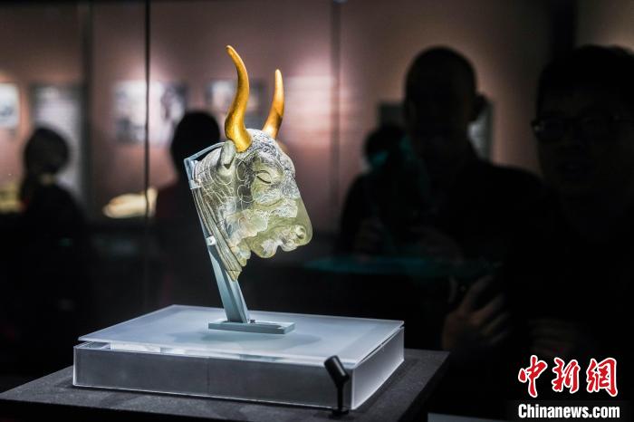 4月14日,“代达罗斯:希腊克里特岛的神话”特展在故宫博物院开幕,图为展览现场的公牛头形状来通杯。 中新社记者 张祥毅 摄