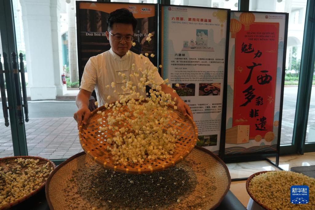 5月21日,中方工作人员在越南首都河内举办的推介活动上展示茉莉花茶工艺。