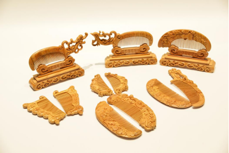 在此基础上,衍生打造了多种桃木工艺品,包括传统的剑、斧、桃符、桃人、桃印等,也有如意、牡丹、葫芦、喜鹊登枝、麒麟送子以及龙、凤、花、鸟、人物等吉祥摆件,还有各种配饰和镇纸、笔架、笔筒、龙凤镜等实用物件。