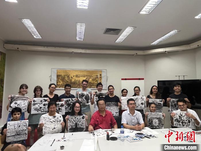 日前,湖北大学艺术学院谭崇正、邓鸿涛两位书画名家走进圣保罗州立大学孔院及当地多所公立小学,开展水墨画工作坊。图为水墨画教学现场。中新社记者林春茵摄