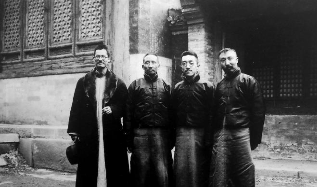 蔡元培与胡适(右二)、李大钊(右一)、蒋梦麟(左一)在北京西山卧佛寺