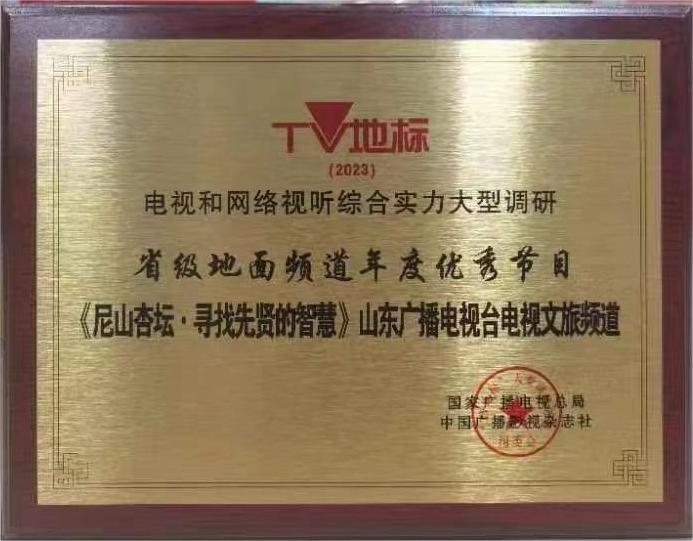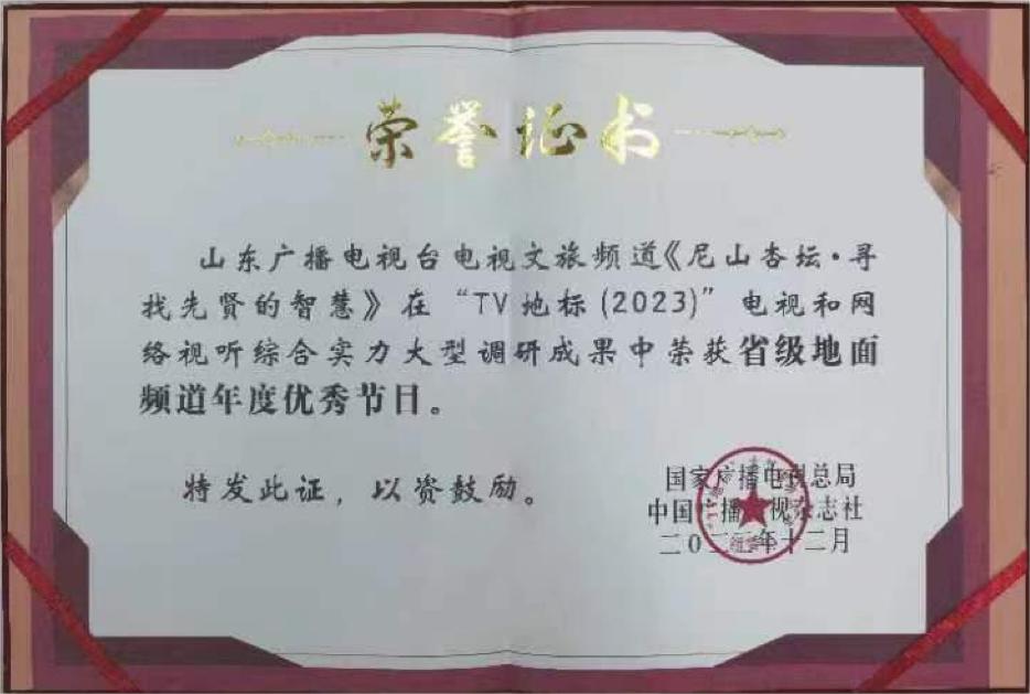 12月19日,在由国家广播电视总局主管《中国广播影视》杂志社主办的“TV地标(2023)”电视和网络视听暨“时代之声”广播业综合实力大型调研成果发布会上,由尼山世界儒学中心、山东广播电视台电视文旅频道联合制作的大型文化探源节目《尼山杏坛·寻找先贤的智慧》获得省级地面频道年度优秀节目。
