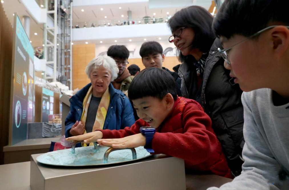 1月31日,上海甲辰龙年生肖特展开幕,小朋友在体验青铜“龙洗”的共振效果。新华社发