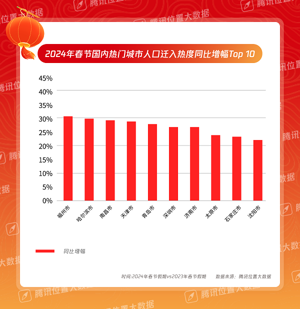 与2023年春节假期相比,上述36个城市的迁入人口全部实现增长,其中青岛、济南人口迁入热度同比增幅跻身全国前十,或许可以印证当前山东文旅的火爆。