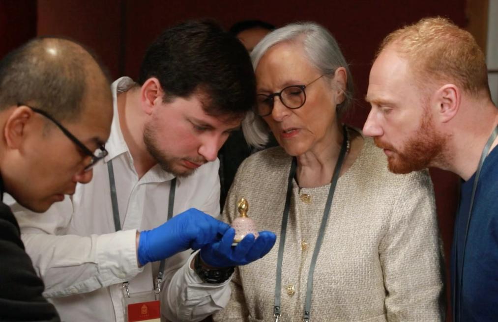 2024年3月25日,中法两国文物工作者在故宫文华殿检查由法国运抵的文物。新华社记者夏子麟摄