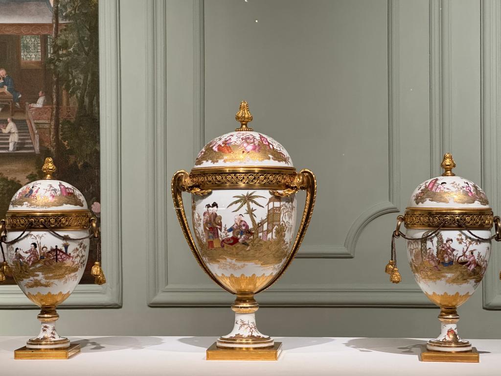 此次展览中,许多展品体现出这样“东风西渐”的特点。比如,法国路易十六王后收藏的一组三只白色蛋形“中国风”瓷瓶,由法国塞夫尔御用瓷厂借鉴中国制瓷经验制造,法国画师在瓶身上描绘出中国人饮茶等日常生活场景并以铜鎏金装饰,“中西合璧”得到完美诠释。