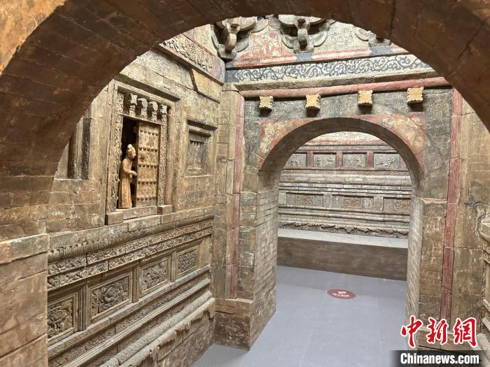 展览现场,山西博物院藏文物金代砖雕壁画墓郝匠金墓以裸展的形式在展厅呈现,800多年前的墓葬整体“搬进”展厅,吸引民众走入其中,一览金代民间构建的“往生后的世界”。
