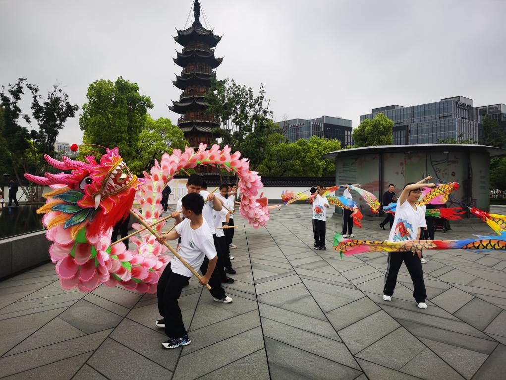 2024上海龙华庙会现场,中学生舞动“桃花龙”。新华社记者 陈爱平 摄