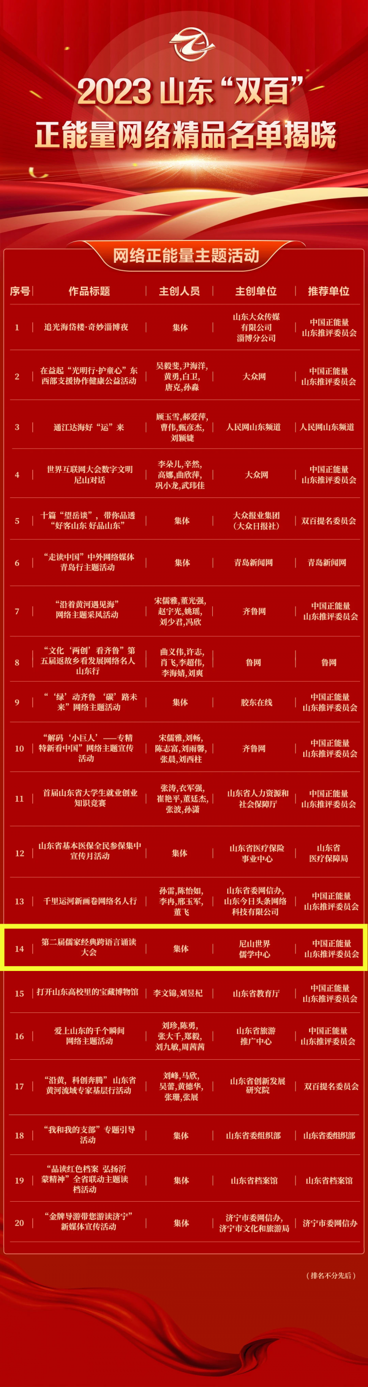 由山东省委网信办主办的2023山东“双百”正能量网络精品评选活动今天揭晓结果,经过初评、终评并公示结果,200件网络精品脱颖而出。