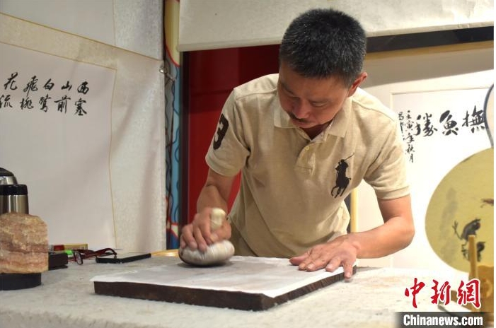 图为南昌鱼拓非遗传承人姜昌贵正在创作。巫发阳摄