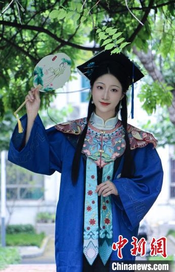山东大学2024届毕业生姜艺身穿学位服,肩挂“海阔天高”云肩,头戴非遗绒花学位帽。(资料图,山东大学供图)