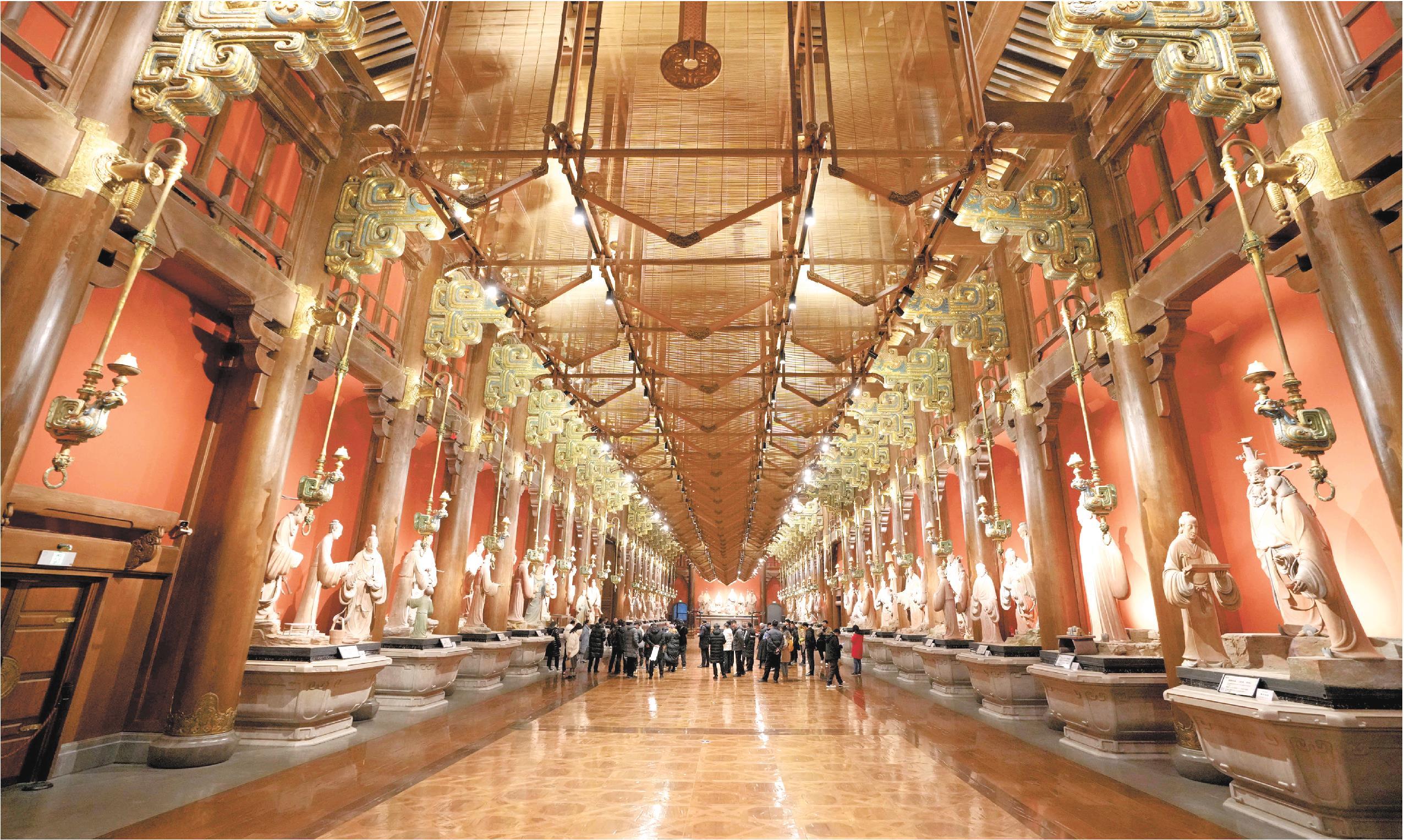 2023年12月14日,游客在曲阜“尼山圣境”参观七十二贤廊里的雕塑。(□新华社发)