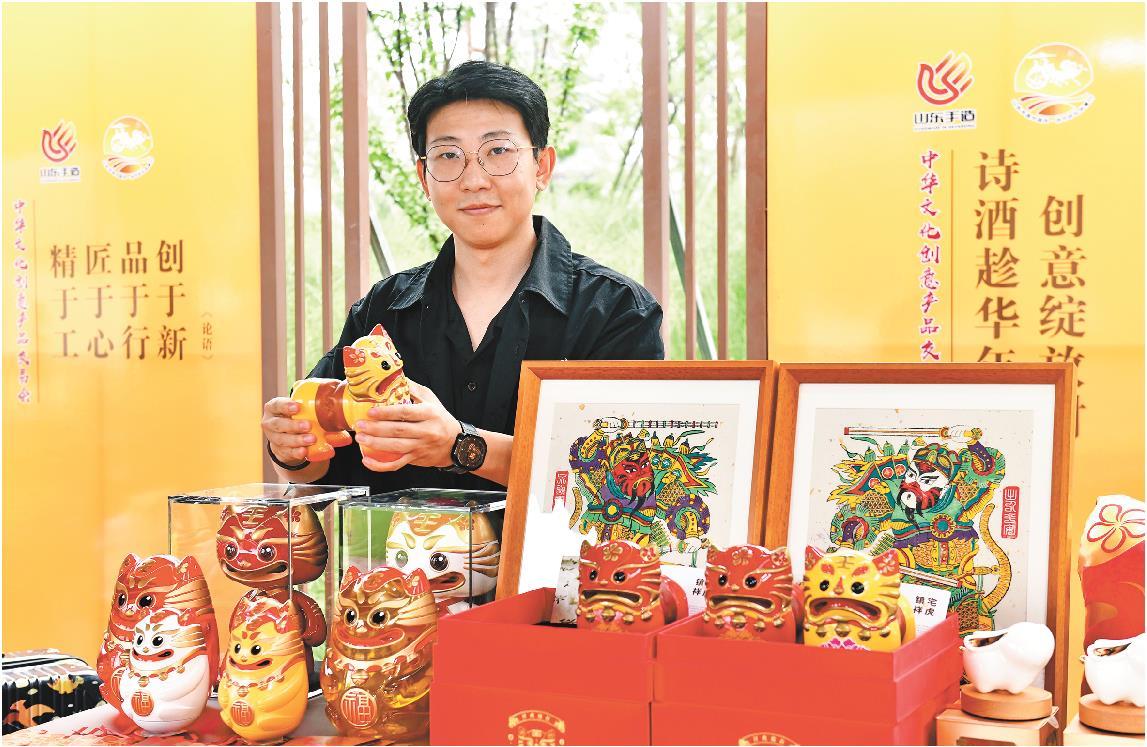 第九届尼山世界文明论坛“山东手造”精品展区,与会人员介绍高密泥老虎作品。(□新华社发)