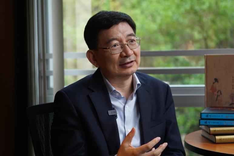 香港商务印书馆总经理兼总编辑毛永波在接受记者采访(4月30日摄)。新华社记者 龙镜伊 摄