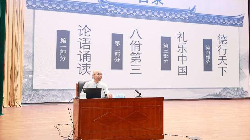 曾教授围绕解读国学经典内涵、弘扬中华优秀传统文化精神,以《学而》《为政》中相关重点进行导学,重点讲解了《八佾》内容,结合《易经》对孔子的为政思想、道德主张及其现实意义进行了详细阐述,并在美德健康新生活方面进行了延伸解读,授课内容系统全面、内涵丰富。