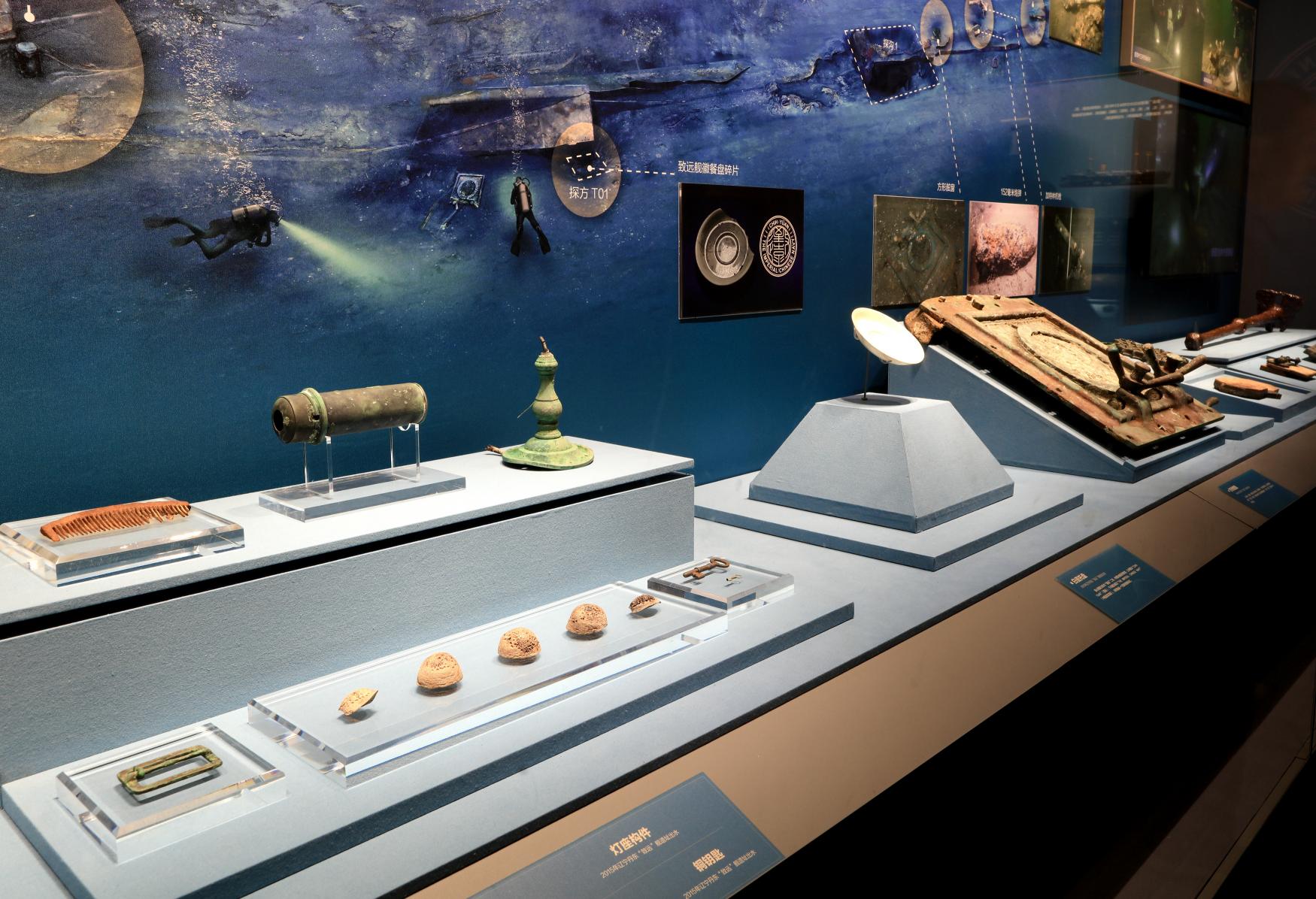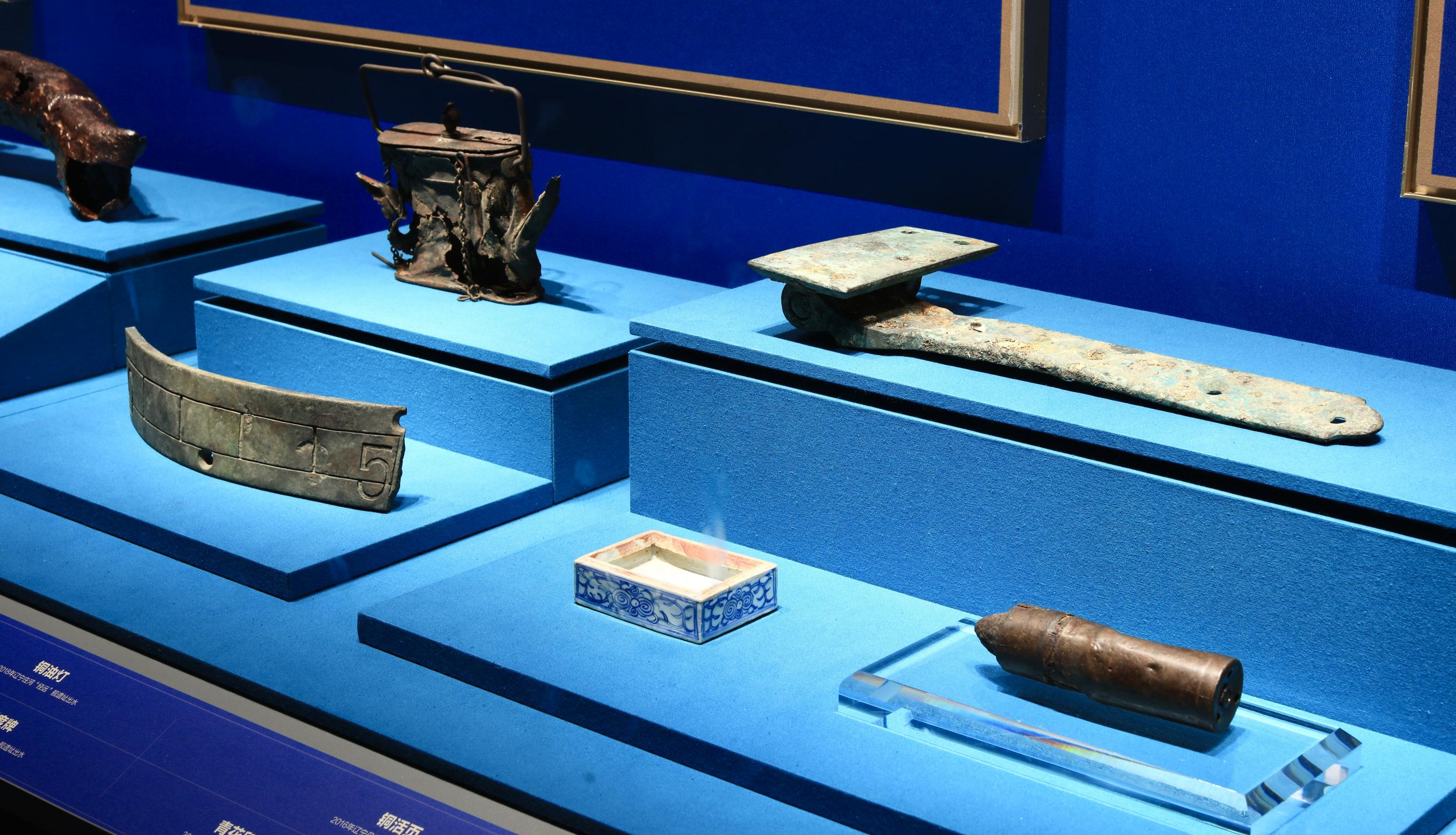 “经远”舰遗址出水的铜油灯,“致远”舰遗址出水的刻度牌、铜活页、青花印泥盒、炮穿甲弹