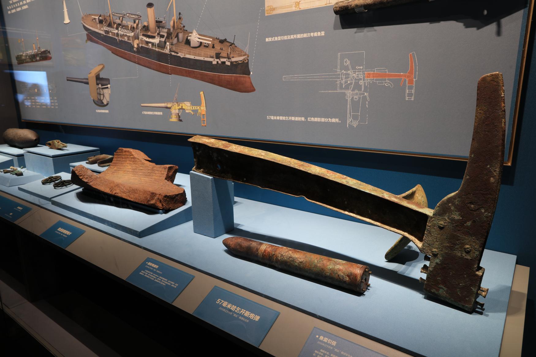 “致远”舰遗址出水的速射炮肩托、炮弹、鱼雷引信等