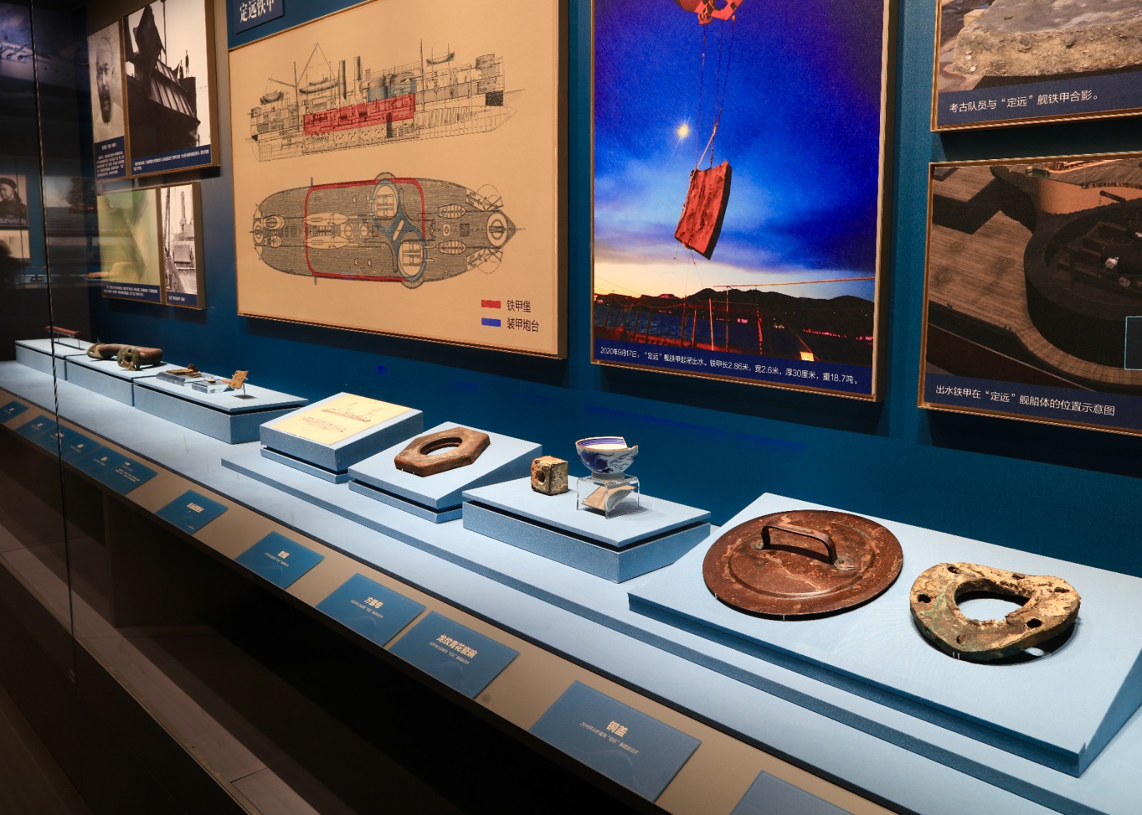 2019年-2020年山东威海“定远”舰遗址出水的定远舰图纸、垫圈、方螺母、龙纹青花瓷碗、铜盖等