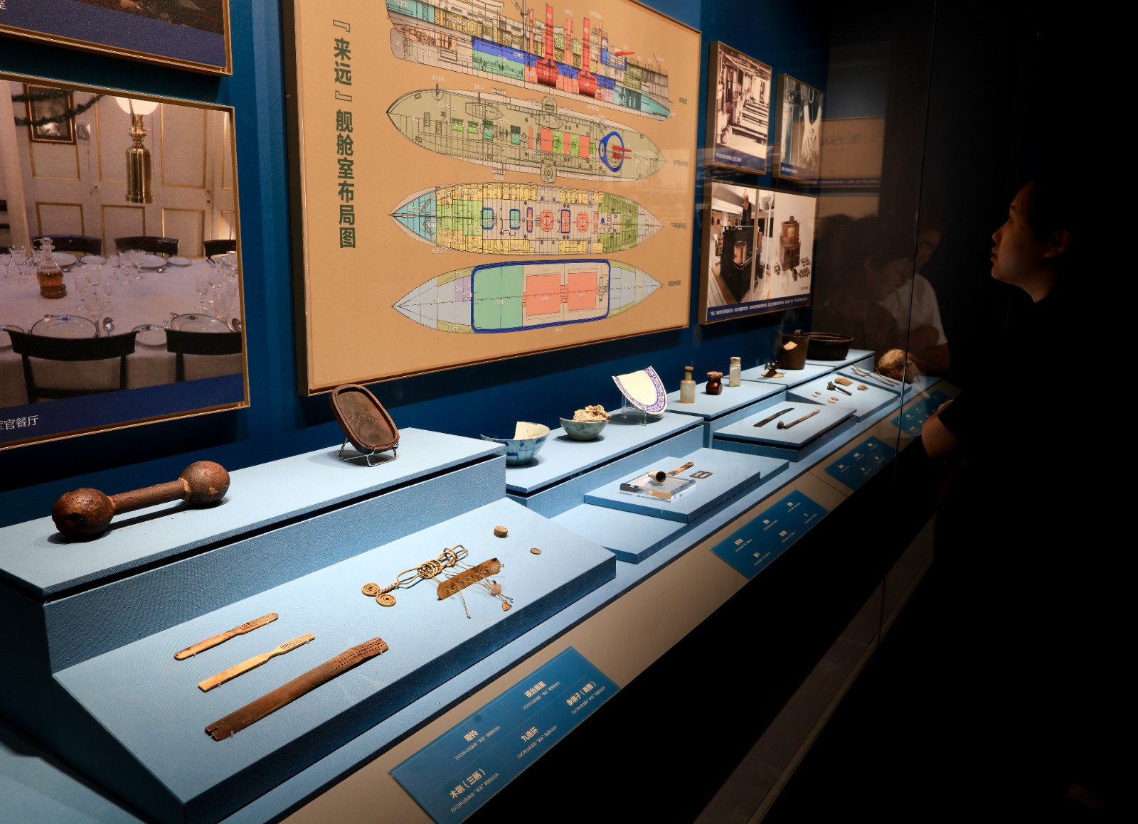 展览分为三个部分,第一部分“归去”通过水下文物、史料记载与历史影像,描绘出北洋海军的兴衰史及甲午海战的惨烈,还有将士们坚韧不拔的战斗精神和英勇气概;第二部分“来兮”则展示了五艘北洋沉舰出水的珍贵文物及水下勘察打捞影像;第三部分“传承”介绍中国水下考古史以及在甲午沉舰的探寻过程中,研究出沉船水下考古的新方法。