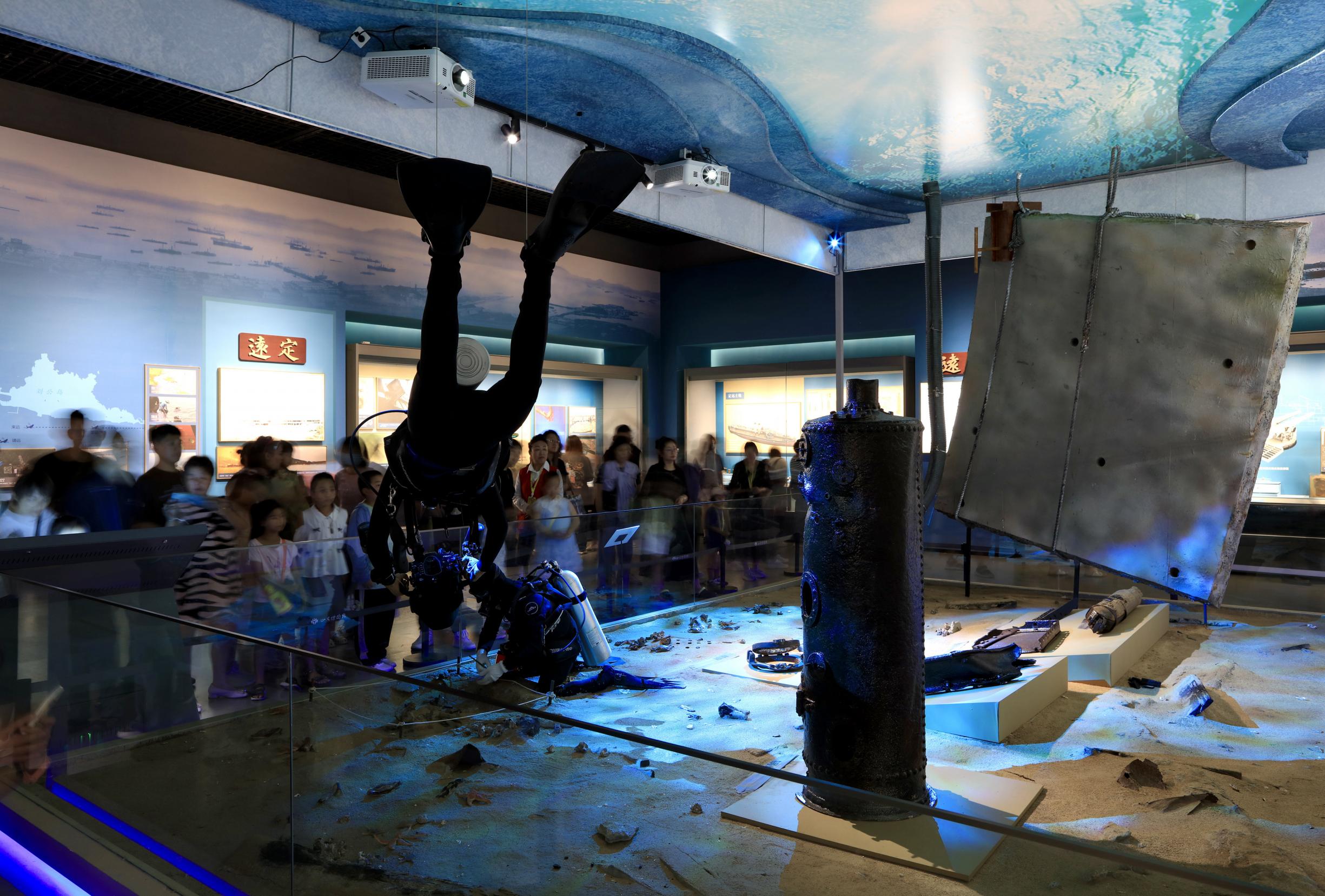 展览设计采用重点展品与水下考古复原场景融合展示,序厅矗立扭曲残破的“经远”舰4米长2米高的船体铁板,强烈的视觉冲击力迅速让观众感受到展览的主题和理念。根据不同的展览内容定制展区色彩:硝烟褐(北洋海军兴衰和甲午海战的惨烈);深海绿(甲午沉舰打捞工作及沉舰文物的集中展出);筑梦蓝(十年水下考古工作和向海图强等主题)。符合每一板块的色调进一步拉近观众与展览的距离,观展心情也随之起伏变化。展厅中心区域重点打造成展览的亮点,将“定远”舰炮台铁甲与水下考古工作场景相互结合。环幕多媒体背景再现甲午海战真实画面,等比例展现展品与水下考古工作的艰辛。观众沉浸式感受甲午沉舰前世今生的同时,可以打卡拍照留念。除此之外,展览中采用数字媒体互动展示水下考古工作流程,水下考古科普知识问答小课堂等趣味展项。观众了解甲午海战历史史实和水下考古成果的同时,轻松读懂研究性和实践性于一体的水下考古知识。尾厅对整体展览做了一个提升,新时代向海图强、经略海洋的历史巨变,折射出民族屈辱、觉醒和复兴的历史内蕴,标示着国家奋进、崛起和强盛的历史进程。