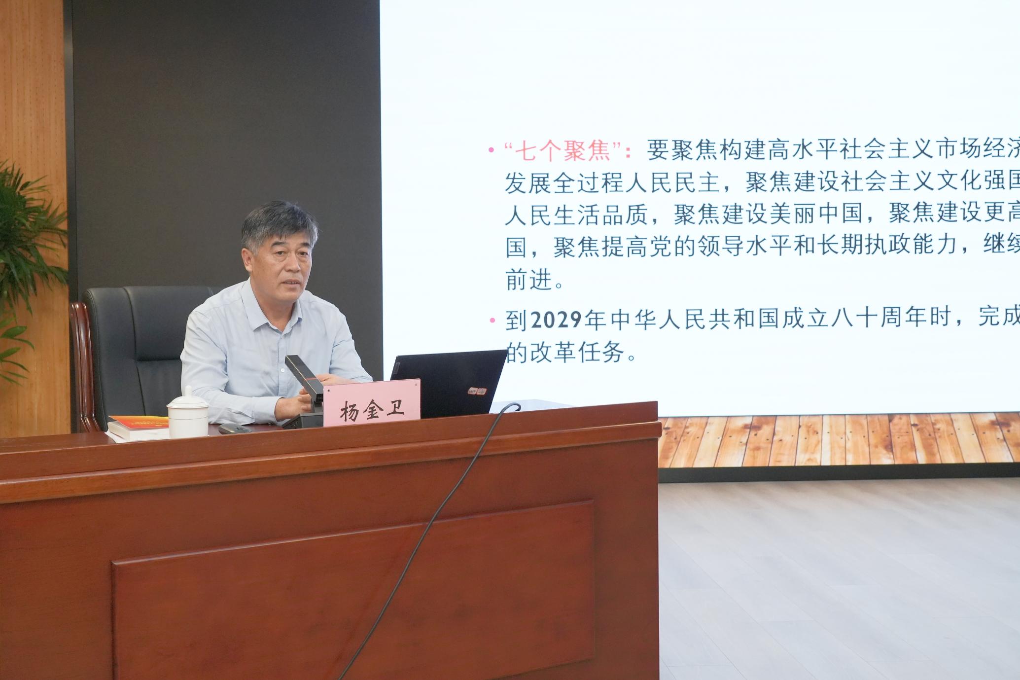 省直机关宣讲团成员、山东社会科学院党委委员、副院长、二级研究员杨金卫在开班式上作宣讲报告。杨金卫全面阐述了进一步全面深化改革的总目标和重大原则,围绕经济、政治、文化、社会等领域进行深入讲解,并结合儒学中心(基金会秘书处)工作实际,深入分析深化文化体制机制改革的具体内容,深刻论述了加强党对进一步全面深化改革的领导和深化党建制度改革的重要意义。