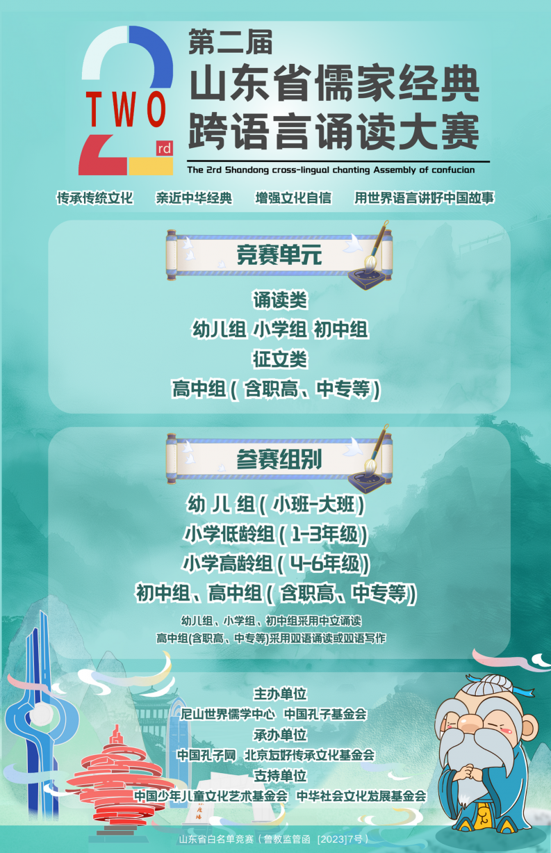为深入学习贯彻习近平文化思想,坚定文化自信,赓续中华文脉,引领青少年深入学习中华经典,推动中华优秀传统文化创造性转化、创新性发展。根据《山东省教育厅关于公布面向中小学生的全省性竞赛活动名单(2023-2025年)和全国性竞赛活动在山东省备案通过名单的通知》(鲁教监管函〔2023〕7号)要求,尼山世界儒学中心、中国孔子基金会举办第二届山东省儒家经典跨语言诵读大赛,并制定如下方案。
