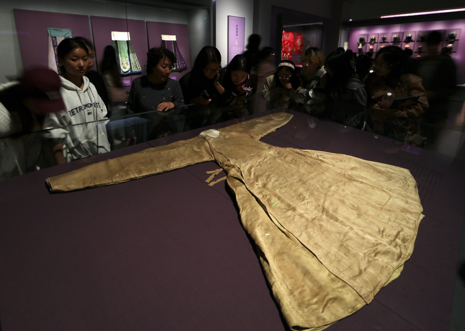 图为在山东邹城市朱檀墓出土的明代织锦盘龙纹黄缎袍展示 侯新建 摄