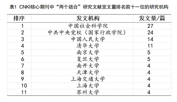 “两个结合”研究发文相关机构分析。从453篇文献的期刊分布看,在有关“两个结合”的研究文献中,主要发表在中文社会科学引文索引来源期刊(CSSCI)、北大中文核心期刊和中国人文社会科学来源期刊(AMI)上。研究成果较多的单位有中国社会科学院等(详见表1)。
