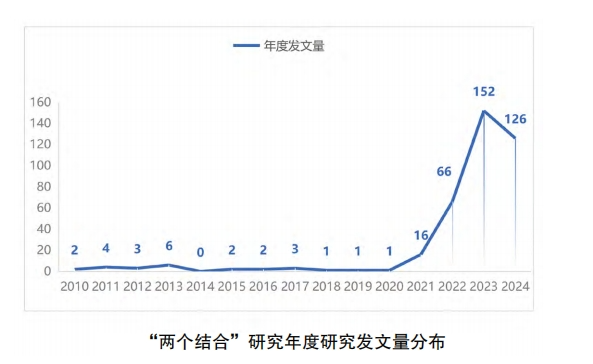 “两个结合”研究热度趋势度分析。CNKI核心期刊中关于“两个结合”的相关研究的第一篇研究文献发表于1992年。2020年以前,CNKI收录的相关研究文献数量较少。1992—2020年,相关研究文献数量逐渐增长。但较为明显的是,自1992年至2020年的28年间,年发文量始终维持在10篇以下。自2021年至2024年,发文量有了明显上升,2021年开始,年度发文量超过15篇,发文数量有了显著增加,2023年(152篇)达到峰值(详见下图)。从发文时间节点来看,发文量的变化与党的历次全国代表大会的召开时间节点十分接近。